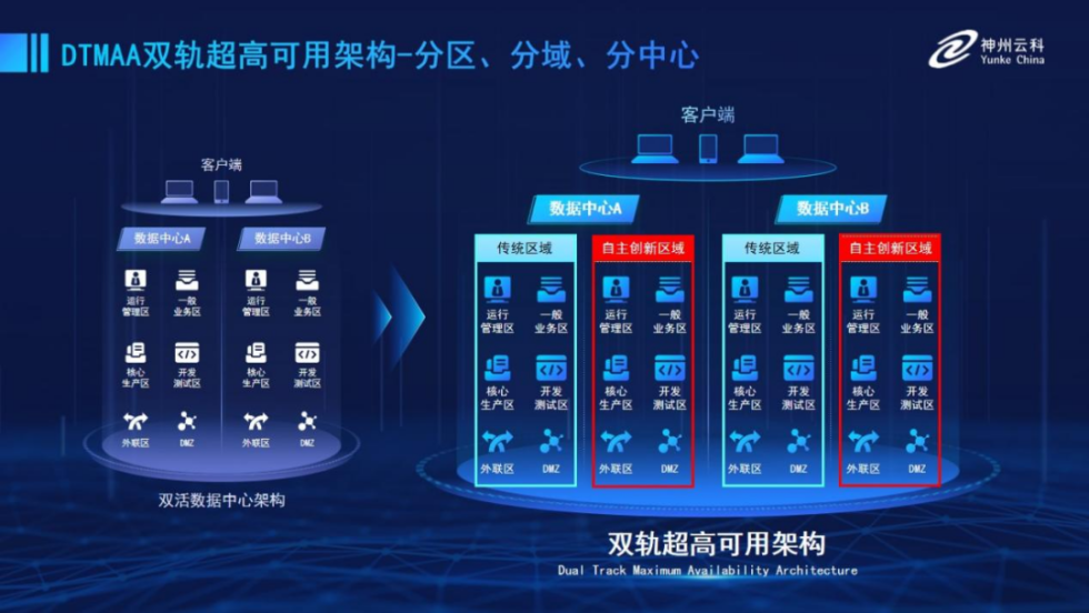 为帮助金融客户更好地应对数字经济时代对可持续性的高要求,实现“信创”与“数字化”齐头并进,开元网页版-开元(中国) 推出了双轨超高可用架构。该架构在双活数据中心的分区调度基础上,增加信创域和非信创域的分域调度,实行信创域与传统域应用全量部署,使双中心运营变为双中心四区域并行运行,互为多活,将“0到1”的单轨建设道路变为分区分域协同的多活双轨超高可用架构。帮助客户在新架构下,保障“信创”的同时解决性能瓶颈,提升稳定性,保证应用可持续性,最终实现信创区域和非信创区域的平滑过渡,完成国产化替代目标。