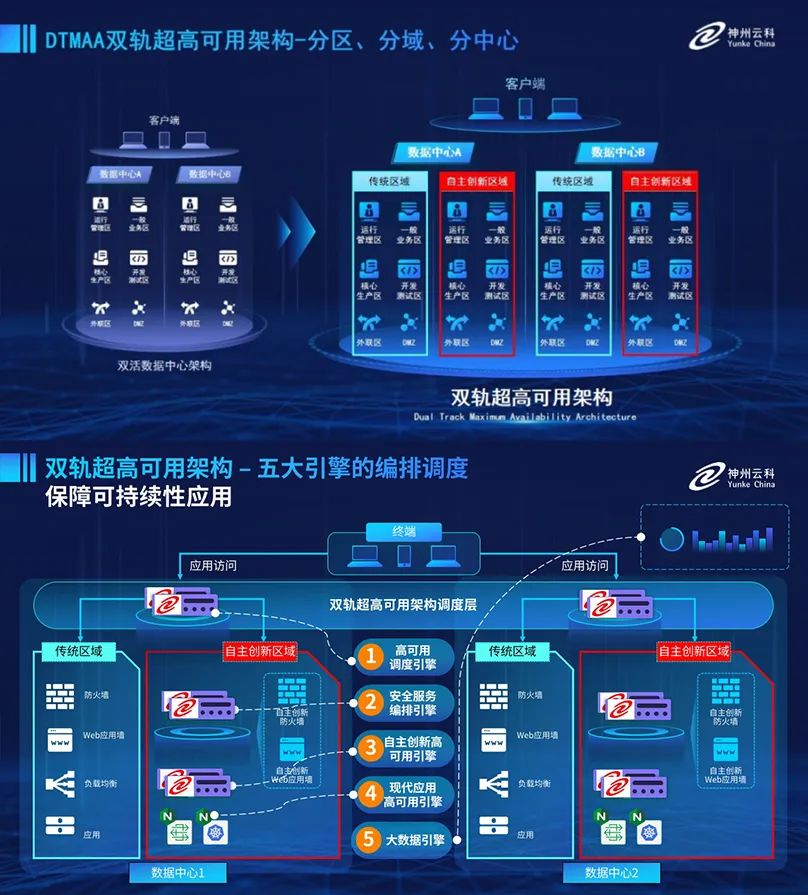 为助力银行业务高质量发展,更好地应对数字经济时代对可持续性的高要求,实现“信创”与“数字化”齐头并进,开元网页版-开元(中国) 创新性的推出了双轨超高可用架构。该架构在双活数据中心的分区调度基础上,增加信创域和非信创域的分域调度,实行信创域与传统域应用全量部署,使双中心运营变为双中心四区域并行运行,互为多活,将“0到1”的单轨建设道路变为分区分域协同的多活双轨超高可用架构。帮助客户在新架构下,保障“信创”的同时解决性能瓶颈,提升稳定性,保证应用可持续性,最终实现信创区域和非信创区域的平滑过渡,完成国产化替代目标。